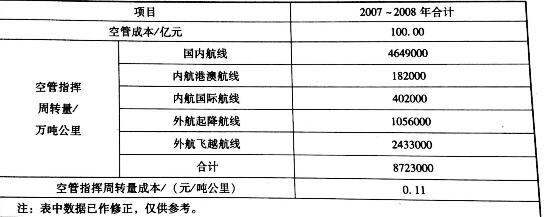 根據(jù)上述方法,統(tǒng)計2007年、2008年各類航線上的實際空管指揮周 轉(zhuǎn)量、航線運(yùn)輸量及運(yùn)輸收入 根據(jù)拉姆齊模型,將運(yùn)輸基礎(chǔ)設(shè)施成本按照不同用戶需求彈性進(jìn)行分 攤,可以得到最大化的社會福利,即價格彈性大的用戶負(fù)擔(dān)較少成本,價格 彈性小的用戶承擔(dān)較多成本。用戶價格彈性可采用相應(yīng)航線上的運(yùn)價表示。 按運(yùn)輸量平均價格將空管成本在國際與國內(nèi)國際快遞之間分?jǐn)傄鶕?jù)國際和國內(nèi)國際快遞周轉(zhuǎn)量價格水平來分?jǐn)偪展艹杀尽TO(shè)空管指揮總成本為C,國 內(nèi)航線上應(yīng)分?jǐn)偟某杀緸镃A,國際航線上應(yīng)分?jǐn)偟某杀緸镃a,對應(yīng)航線 上的空管指揮周轉(zhuǎn)量為T、Ta,對應(yīng)航線上單位運(yùn)輸量的機(jī)票價格為P、 Pa,對應(yīng)的分?jǐn)傆嬎慵礊楦鶕?jù)式計算得到國內(nèi)國際快遞空管指揮周轉(zhuǎn)量成本為0.0701元/噸公里,國際國際快遞空管指揮周轉(zhuǎn)量成本為0.1656元/噸公