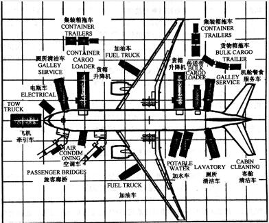 跨境機場保障服務(wù)調(diào)度通常是指機場的場務(wù)指揮調(diào)度,負(fù)責(zé)指揮和協(xié)調(diào)機場地面各項工作何時開始實施及各項異常情況的處置,由機場頭程物流中心負(fù)責(zé)總調(diào)度和總協(xié)調(diào)。及時指令相關(guān)部門進行跑道安全檢查、燈光系統(tǒng)檢查、機位調(diào)度、站坪服務(wù)與各種特種車輛調(diào)度、開放值機和安檢服務(wù)、旅客登機和貨郵裝載等工作,并根據(jù)電商物流航班保障情況,及時協(xié)調(diào)空管和貨運代理公司的運控或簽派部門,隨時掌握航班放行動態(tài)和機場各項保障工作進展動態(tài),及時有序地協(xié)調(diào)各班次的出港航班工作進程,確保航班安全正點出發(fā)。所示為波音777-200型飛機的站坪服務(wù)及車輛分布。