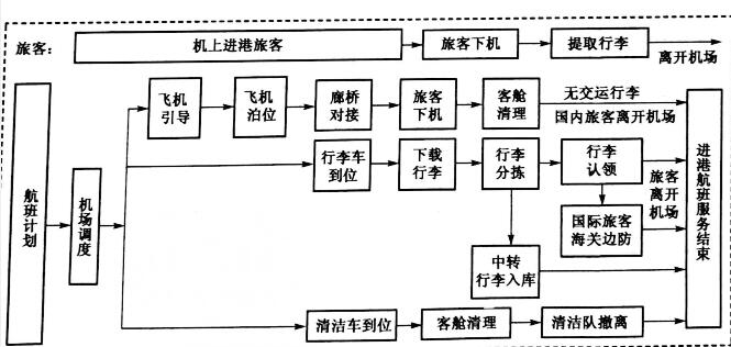 旅客運輸生產(chǎn)流程—進港航班進港航班可以分為兩類,一類終點站到達(dá)航班,另一類是就終點站到達(dá)航班而言,有一類是當(dāng)航班任務(wù)結(jié)束返回基地的航班,可以進入例行檢修或養(yǎng)護。另一類是基地始發(fā)的去終點航班,做短暫裝卸跨境物流貨物后將繼續(xù)執(zhí)飛回程航班飛回始發(fā)基地機場。這一類航班與經(jīng)停航班類似,屬于過站航班,貨運代理轉(zhuǎn)飛安排比較緊湊,尤其在航班發(fā)生輕度晚點情況下,通常會縮短過站時間。因此,這一類航班的地面保障服務(wù)時間較短?;爻毯桨嗯c經(jīng)停航班的區(qū)別在于,前者旅客和行李貨物全部下機,并對機艙進行全部清理,為回程航班旅客和貨郵提供準(zhǔn)備。經(jīng)停航班只有部分旅客和行李貨郵下載,同時在經(jīng)停站有新旅客和行李貨郵搭載后續(xù)航程。在進港航班的旅客或跨境物流中,有一部分屬于中轉(zhuǎn)性質(zhì),這是樞組機場有別于一般機場的重要標(biāo)志。